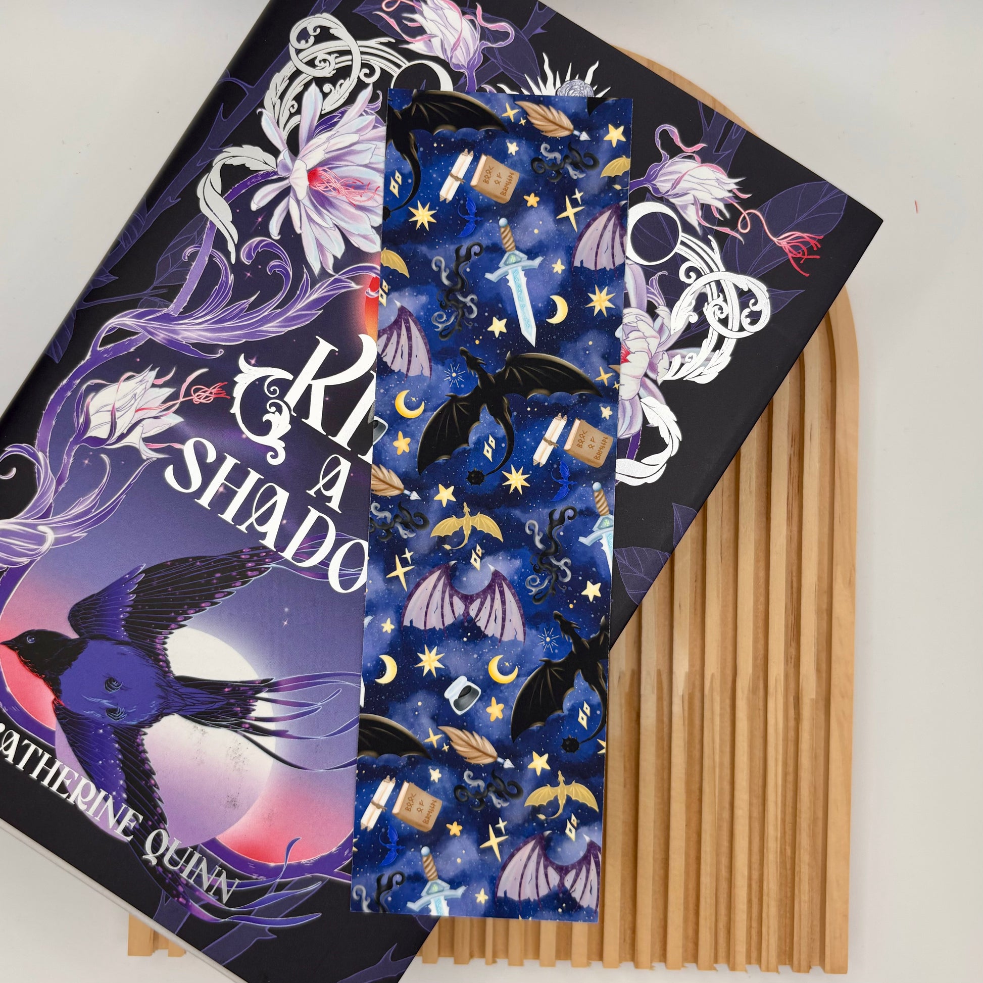 Droom weg in magische werelden met de Draconic Daydream boekenlegger. Dit betoverende fantasy patroon combineert sierlijke draken, glinsterende sterren, boeken, zwaarden en oude scrolls — allemaal op een dromerige blauwe achtergrond die aanvoelt als een portaal naar een ander rijk.