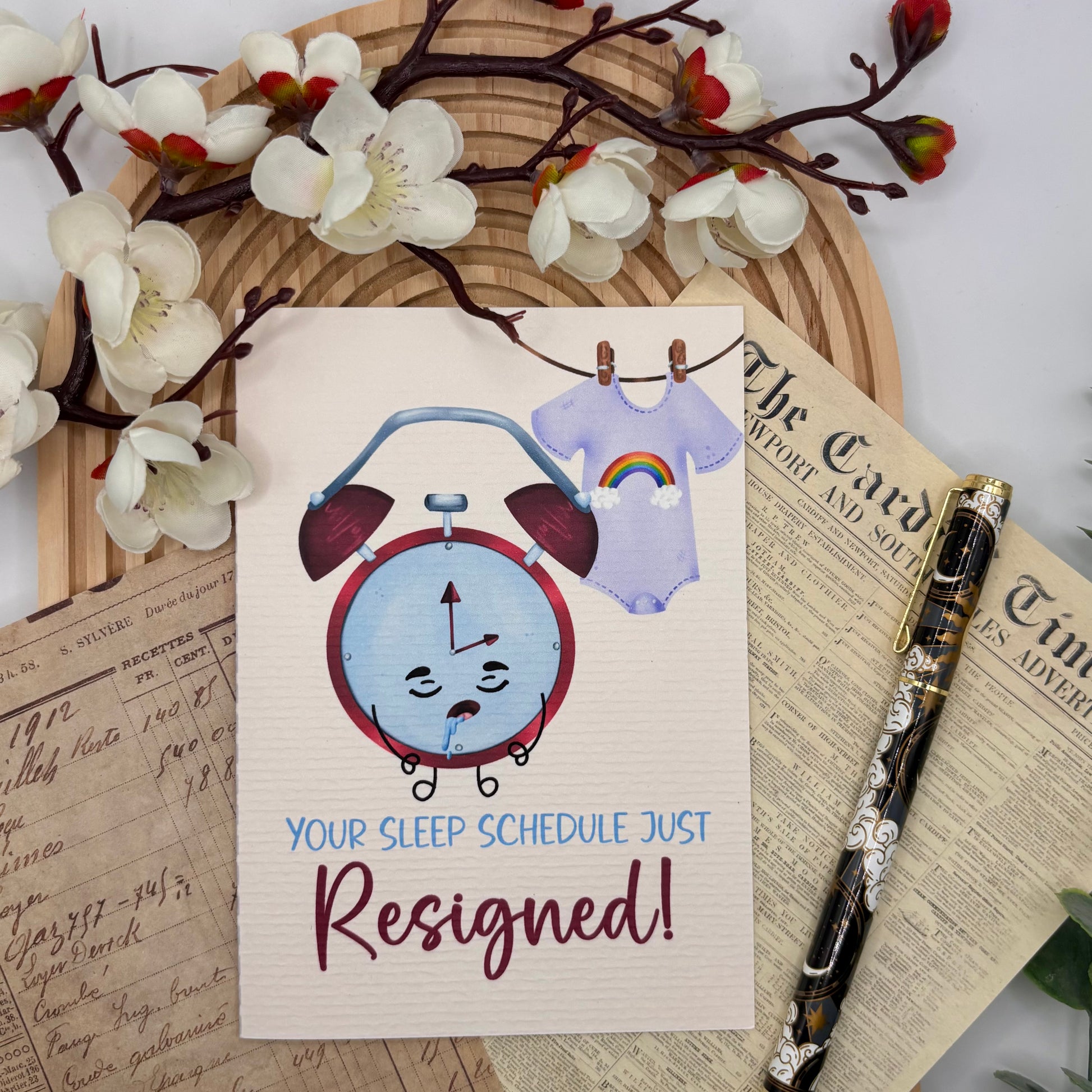 Wenskaart – Your Sleep Schedule Just Resigned | Kawaii Kraamkaart